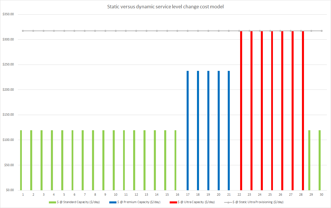 Consider a scenario where the capacity requirement is a constant 24 TiB. But your performance needs fluctuate between 384 hours (16 days) of Standard service level, 120 hours (5 days) of Premium service level, 168 hours (7 days) of Ultra service level, and then back to 48 hours (2 days) of standard service level performance. In this scenario, a dynamic cloud consumption deployment profile looks different compared to a traditional static on-premises consumption profile: