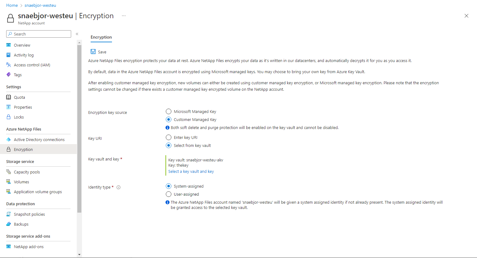 - If you choose System-assigned, select the Save button. The Azure portal configures the NetApp account automatically by adding a system-assigned identity to your NetApp account. An access policy is also created on your Azure Key Vault with key permissions Get, Encrypt, Decrypt.