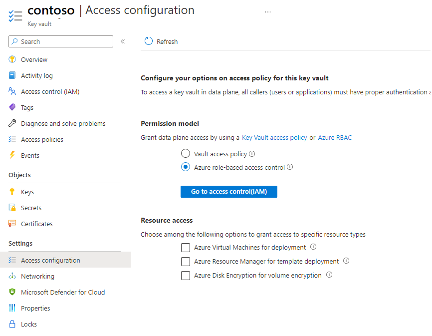 To create an access policy, under Permission model, select Azure role-based access-control.
