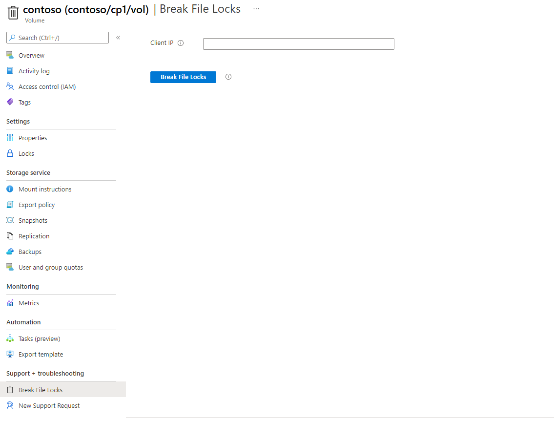 To break file locks for a specific client connected to a volume, enter an IP address in the Client IP. To break file locks for all clients connected to a volume, leave the Client IP field empty.