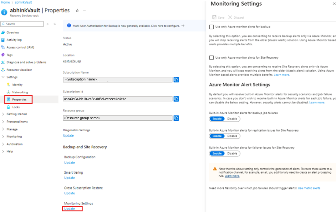 To opt-out of alerts from the Recovery Services vault or Backup vault, go to the specific vault > Properties > Monitoring Settings, and then select Update.
