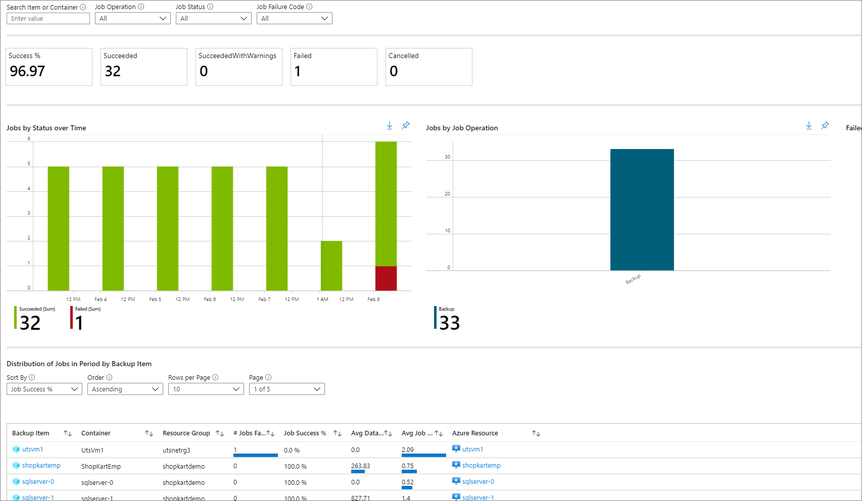 Use this tab to get a high-level overview of your backup estate. You can get a quick glance of the total number of backup items, total cloud storage consumed, the number of protected instances, and the job success rate per workload type. For more detailed information about a specific backup artifact type, go to the respective tabs.