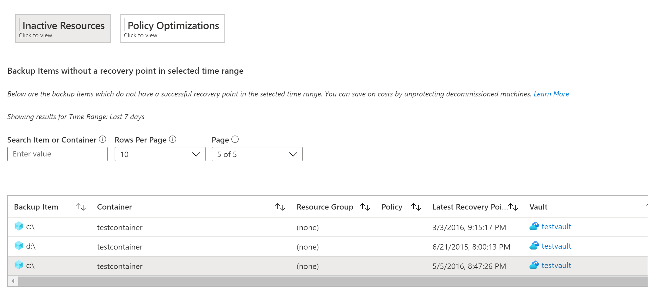 Inactive resources: Using this view, you can identify those backup items that haven't had a successful backup for a significant duration of time. This could either mean that the underlying machine that's being backed up doesn't exist anymore (and so is resulting in failed backups), or there's some issue with the machine that's preventing backups from being taken reliably.