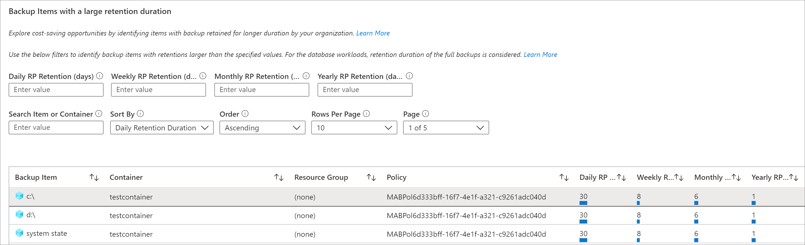 Backup Items with a large retention duration: Using this view, you can identify those items that have backups retained for a longer duration than required by your organization.