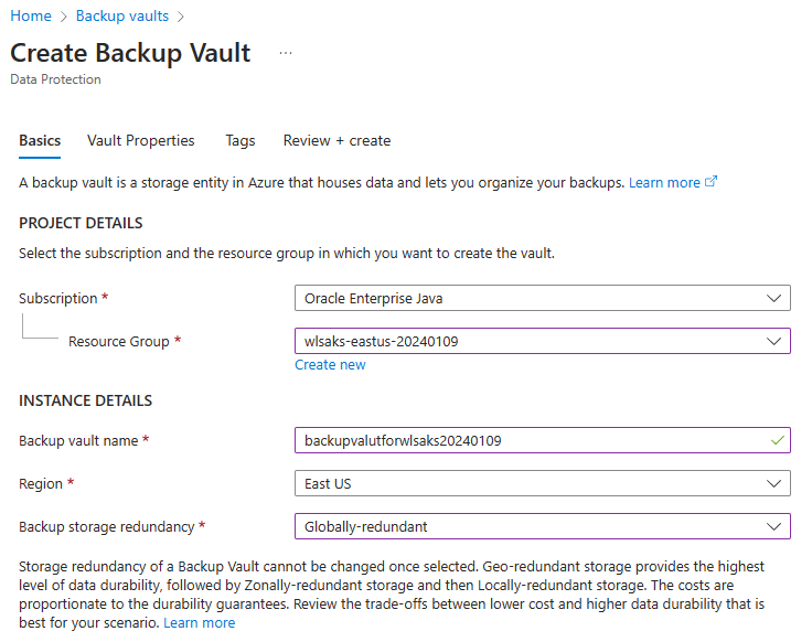 wlsonaks*\wlsaksinstance20240109.Select the latest Operational and Vault-standard backup, then select More options. Select Restore to start the restore process.