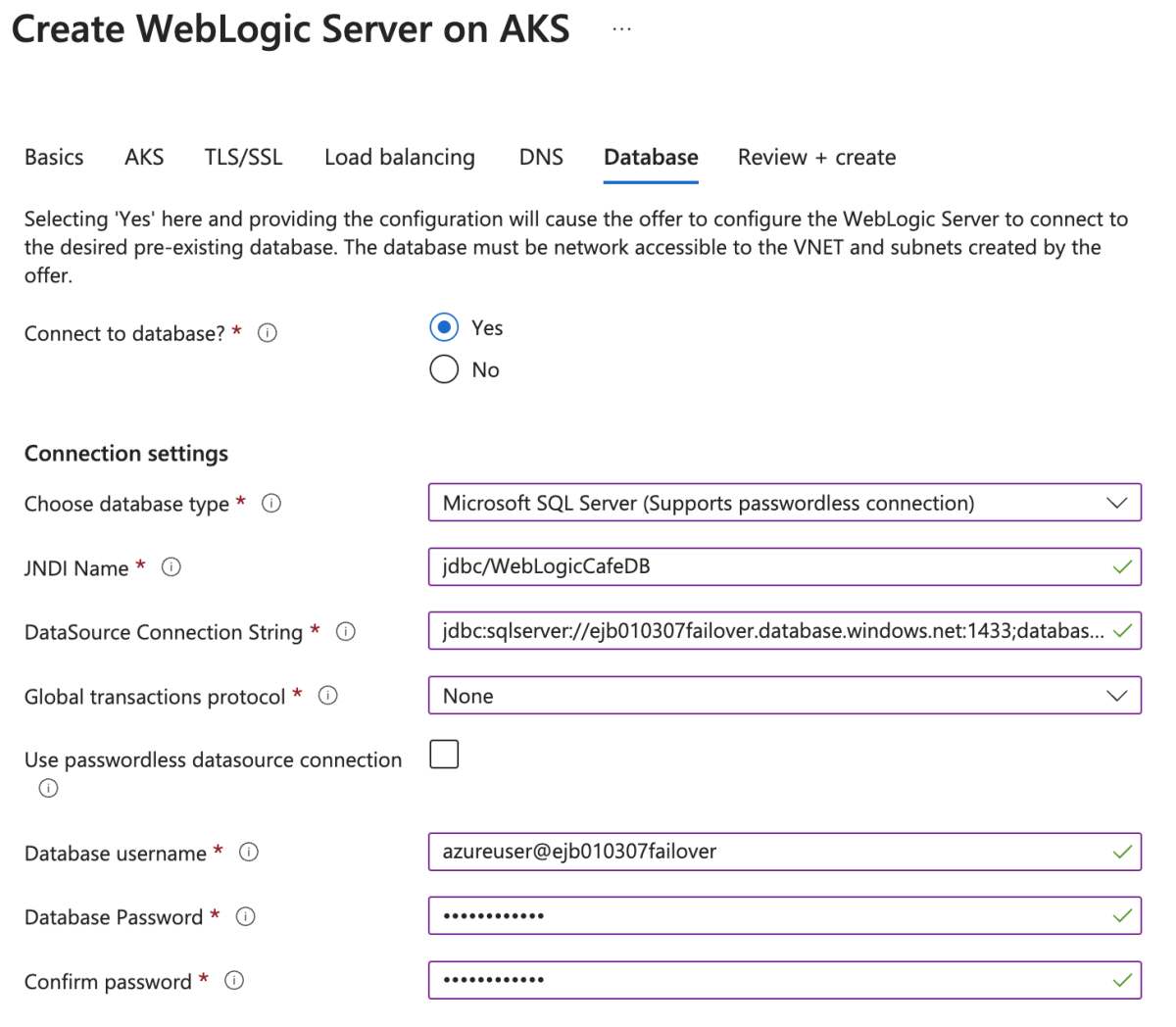 userparameter from the original JDBC connection string and replacing the database name with the first part of the Read/write listener endpoint line. Continuing with the previous example, the value would beazureuser@ejb010307failover. This value is the database admin username.