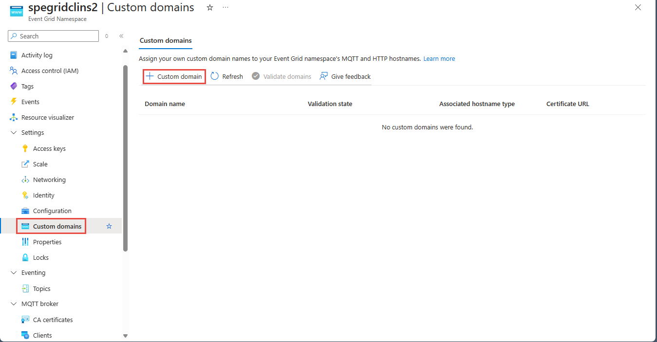 On the Event Grid Namespace page, select Custom domains on the left navigation menu.