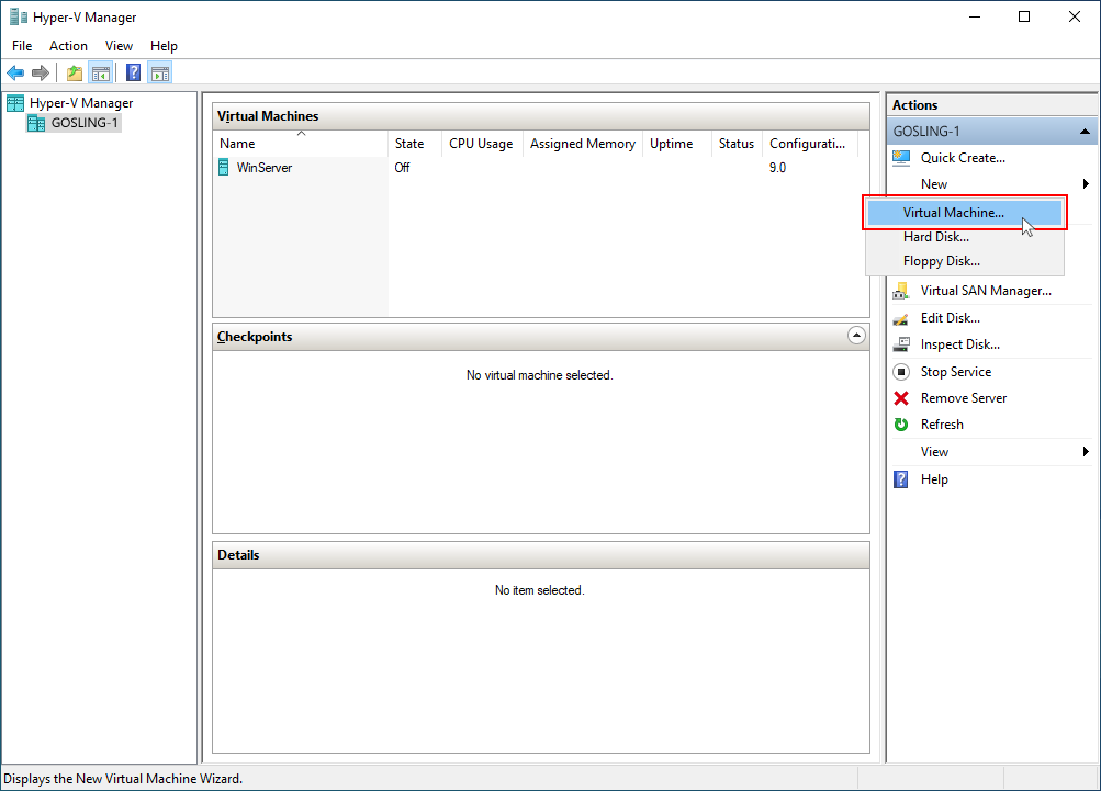 Create a new VM on which to host the agent. Open Hyper-V Manager. In the Actions pane, select New and Virtual Machine... to launch the New Virtual Machine Wizard.