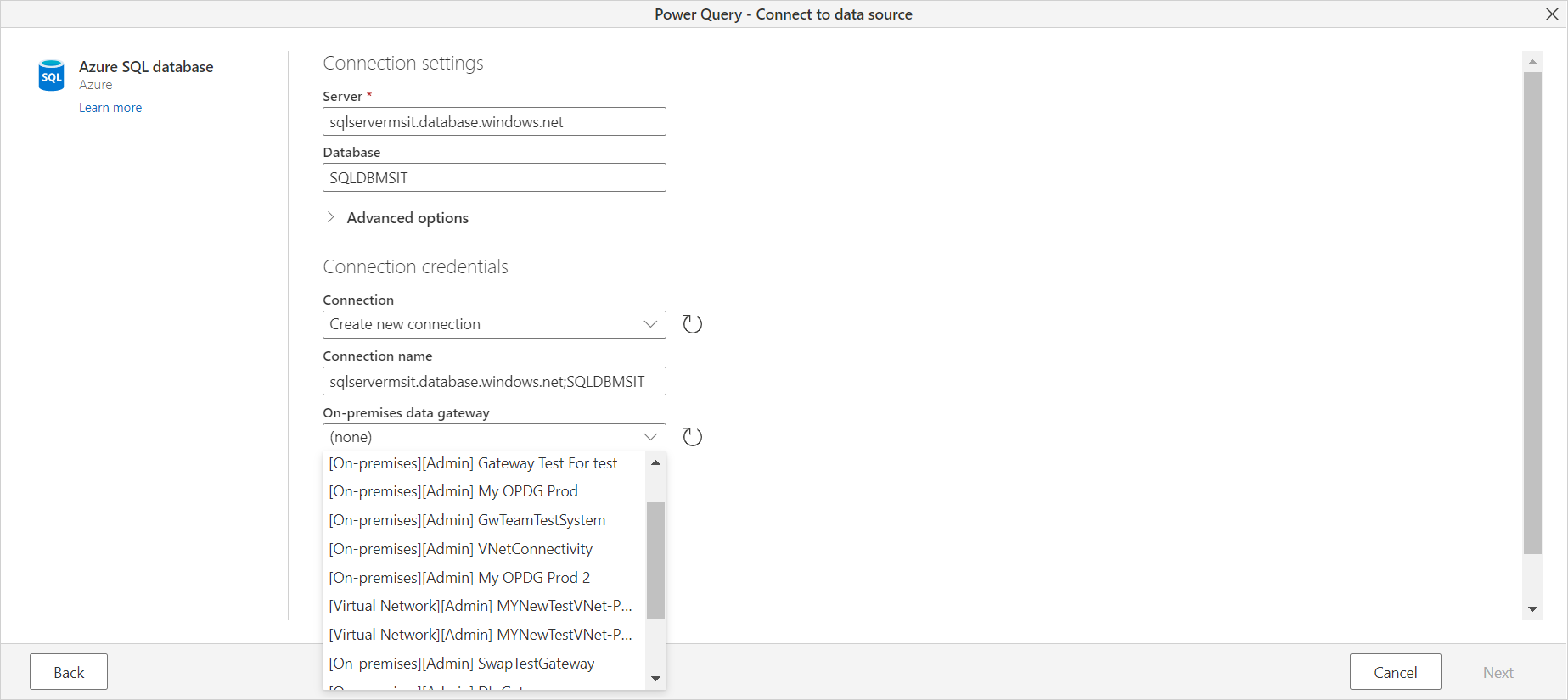 Once you provide the connection details and then connect to data, the VNet data gateways are now included in the On-premises data gateway selections.