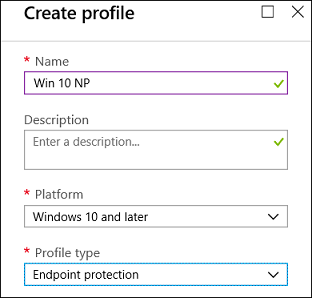 Name the profile, choose Windows 10 and later, select templates for Profile type and choose Endpoint protection under template name.