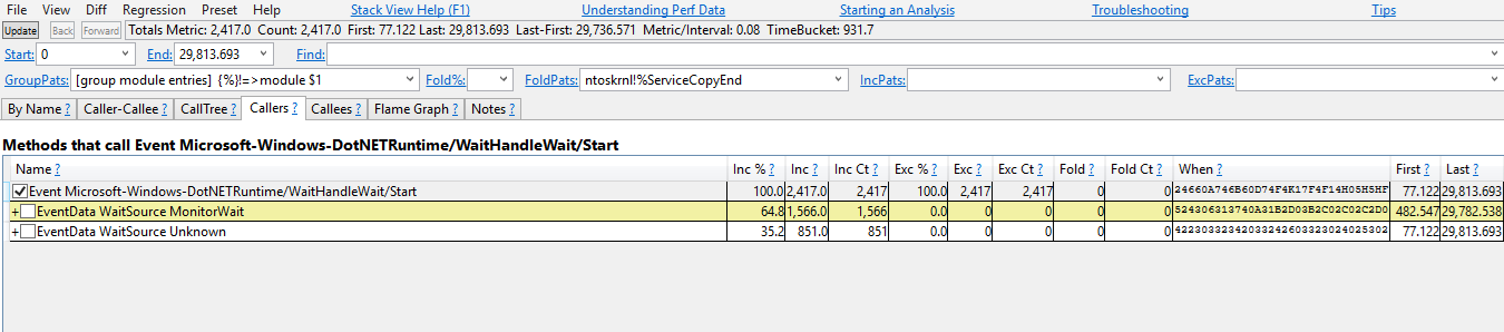 Now you should see the stack traces where the WaitHandleWait events were emitted. They are split by "WaitSource". Currently there are two sources: