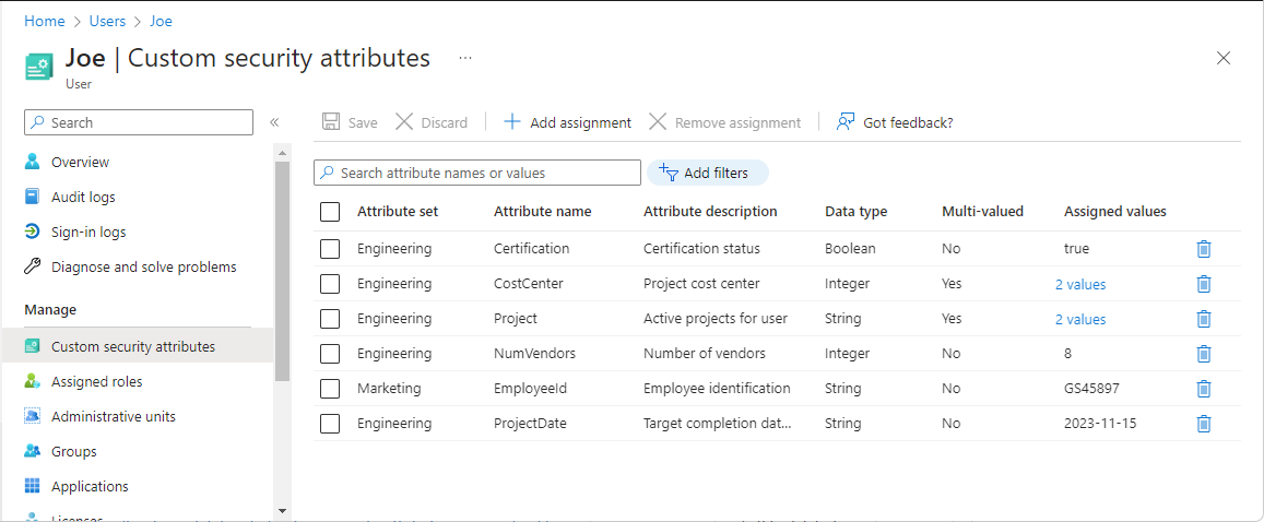 The following example shows several custom security attributes assigned to a user. The custom security attributes are different data types and have values that are single, multiple, free-form, or predefined.