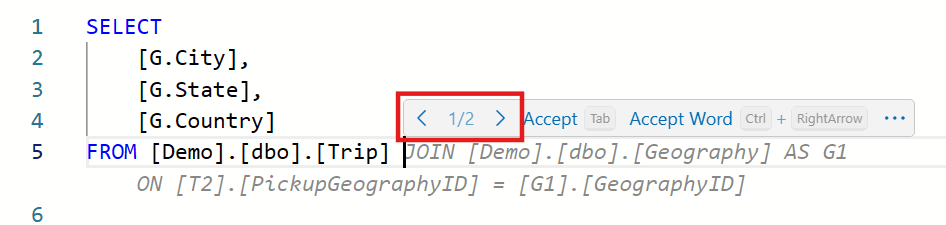 - Auto-complete partially written queries: Copilot can provide context-aware SQL code suggestions or completions for your partially written SQL query.