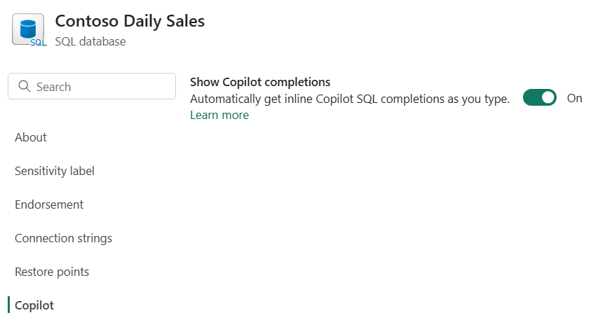 Verify the Show Copilot completions setting in enabled in your database settings.