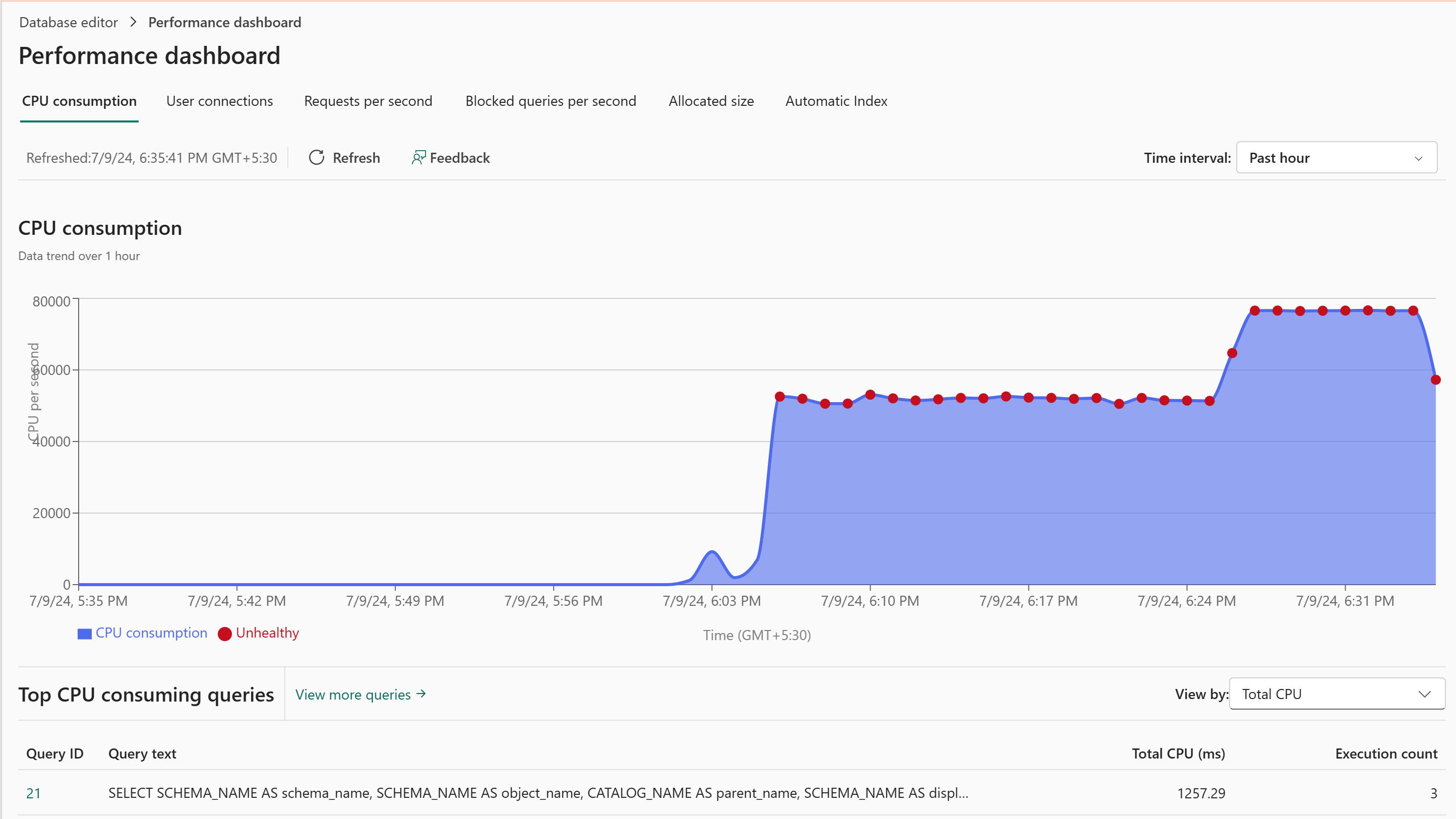 When the database reaches a critical state of CPU consumption (or any other factor that raises an alert), you can see Unhealthy points marked on the CPU consumption tab's graph, marking points where the CPU consumption crossed the threshold value. The time interval is configurable and defaults to 24 hours.