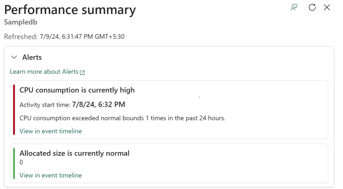 Once you select the link for an alert, the Performance Summary provides a summary of alerts and recent metrics of the database. From here, you can drill into the event timeline for more information.