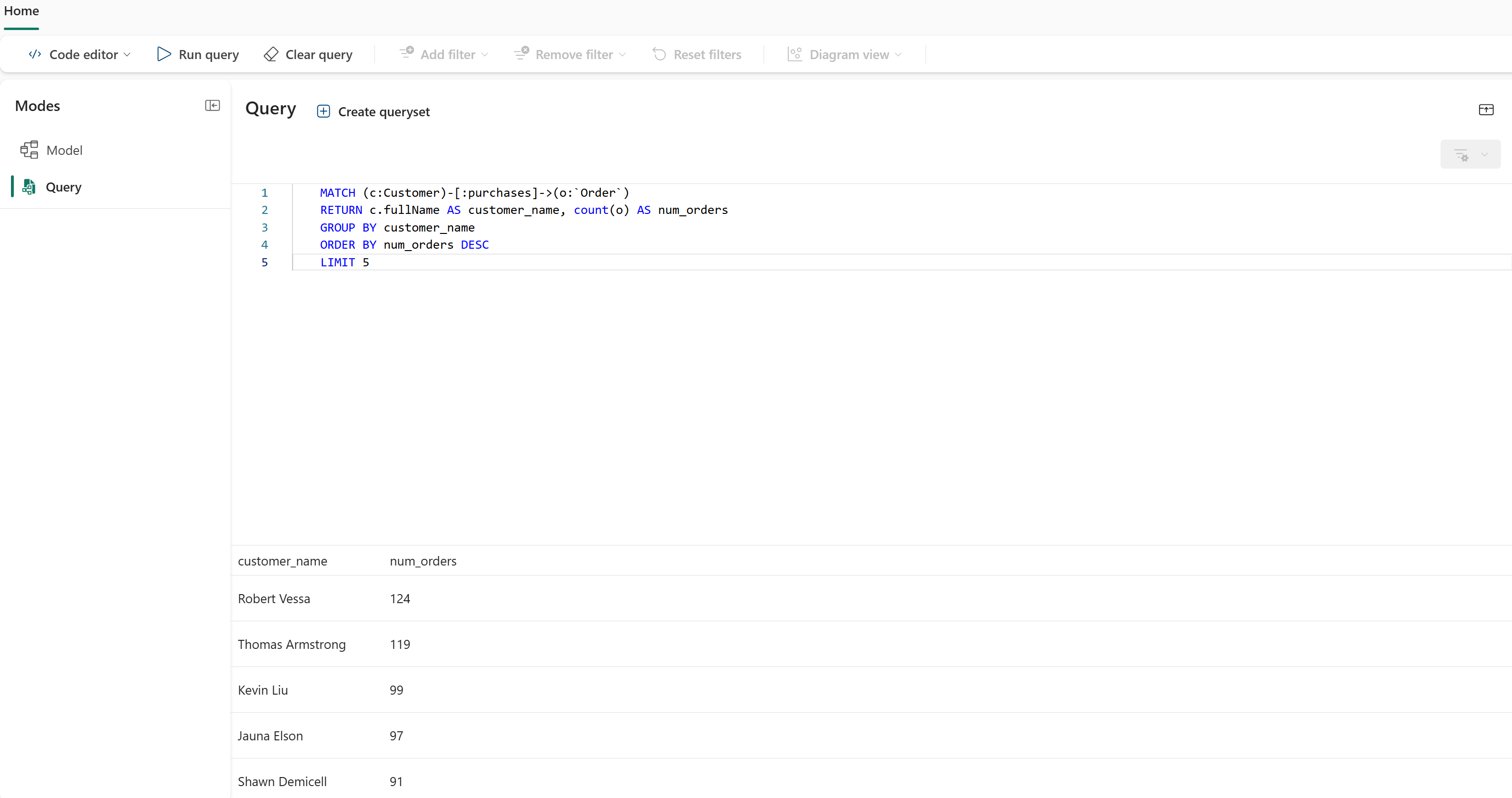 MATCH (c:Customer)-[:purchases]->(o:`Order`) RETURN c.fullName AS customer_name, count(o) AS num_orders GROUP BY customer_name ORDER BY num_orders DESC LIMIT 5Select Run query to see the top five customers by order count.