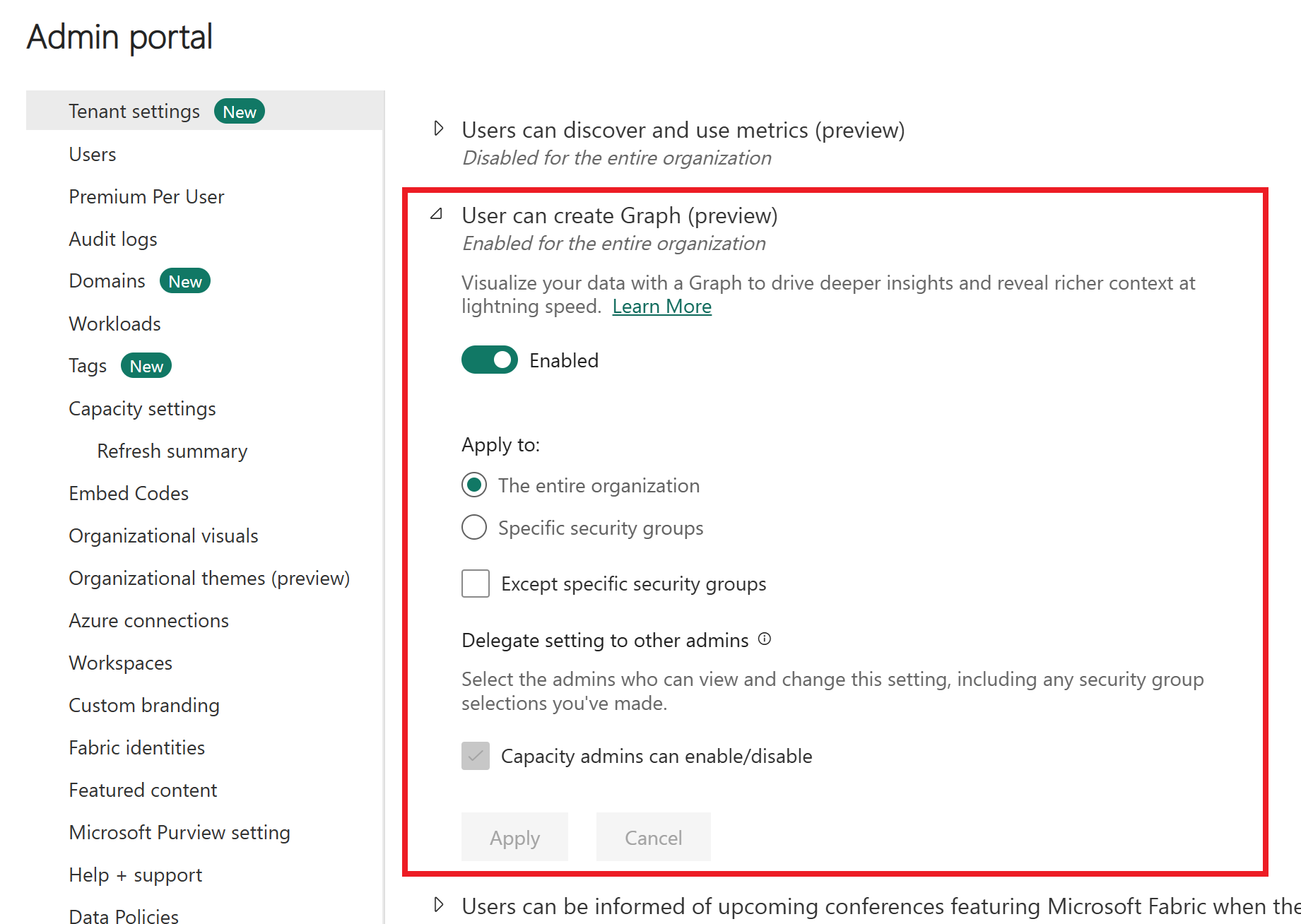 Graph is enabled in your Fabric tenant. A Fabric administrator enables this setting in the admin portal.