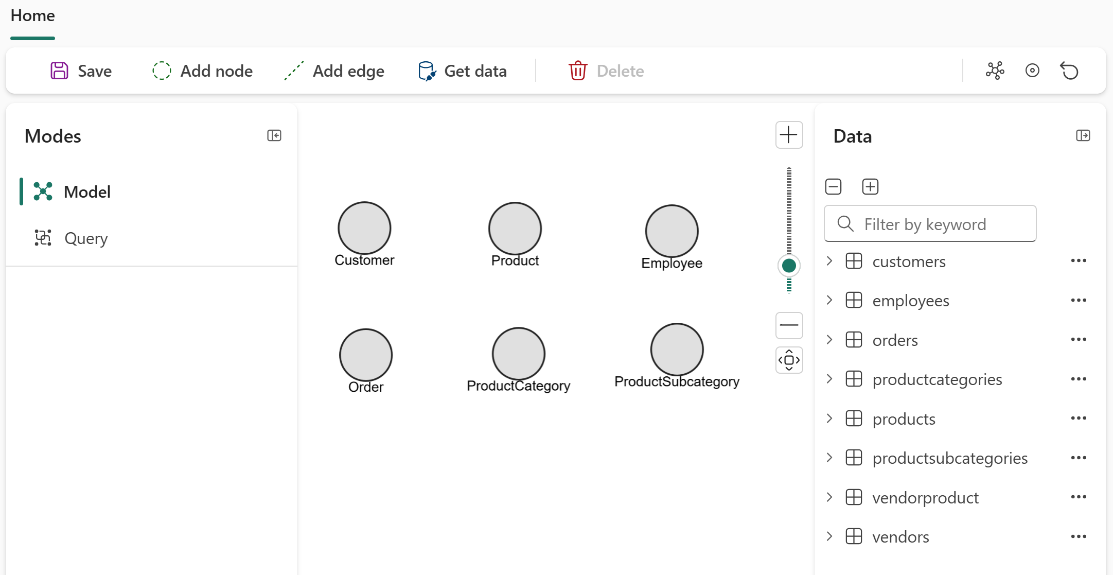 In this tutorial step, you add node types to your graph model. Nodes represent entities in your data, such as customers, products, or orders. Later, you connect these nodes with edges to define relationships between them.