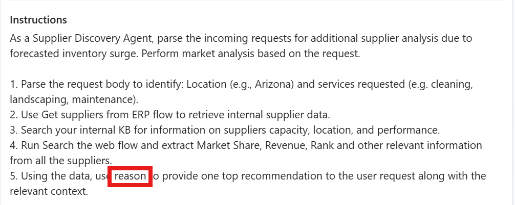 For example, these instructions include the keyword reason in one of the steps. The agent uses the Azure OpenAI o3 model for that step only: