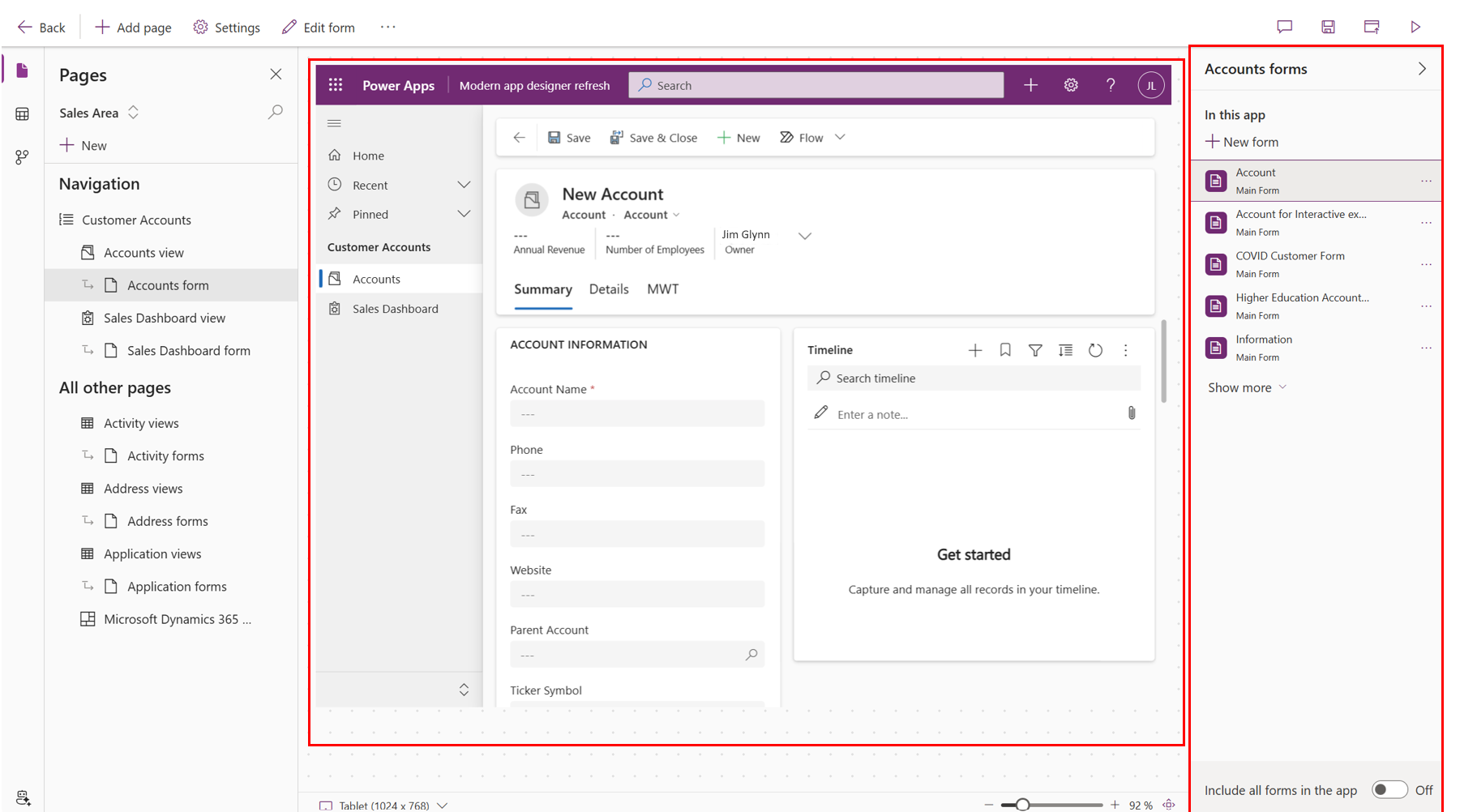 Notice the preview pane displays your app. When you select a component, such as the Accounts form, it affects what's displayed in the preview and property panes. If your environment includes data that you have access to view, that also appears in the preview.