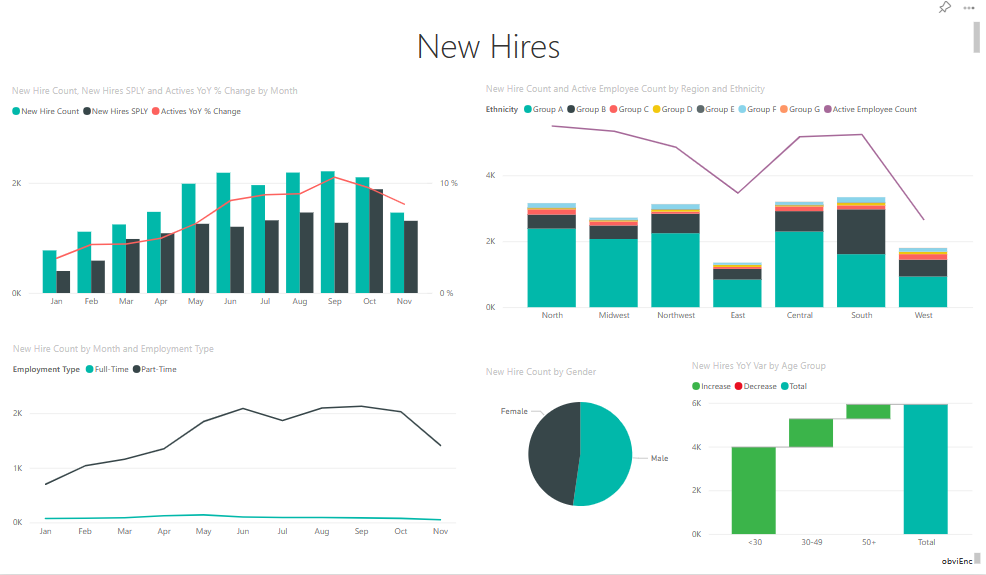 - The New Hires YoY Var by Age Group waterfall chart shows you're hiring mainly younger people. This trend might be due to the mostly part-time nature of the jobs.