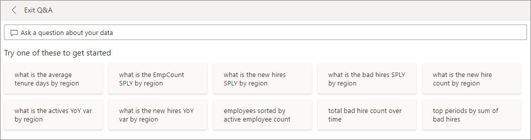 Select the Q&A question box. Even before you start typing, Q&A displays suggestions to help form your question.