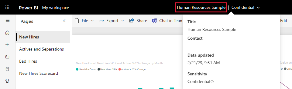 Select Human Resources Sample from the black Power BI header bar to see detailed information about the dashboard.