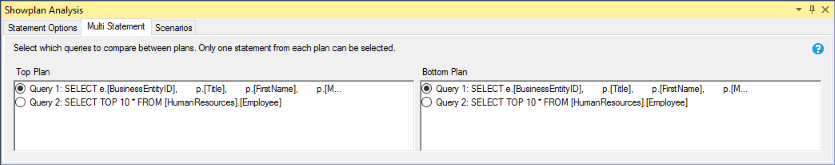 ProdDBandTestDB. This behavior can be changed with the Ignore database name when comparing operators option.The Multi Statement tab is useful when comparing plans with multiple statements, by allowing the right statement pair to be compared.