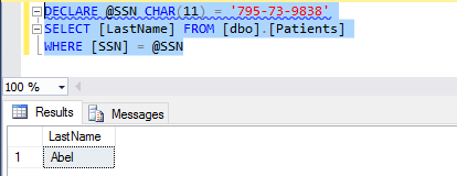 Assuming SSN is an encrypted char(11) column in the Patients table, the below script will attempt to find a row containing '795-73-9838' in the SSN column and return the value of the LastName column, providing Always Encrypted is enabled for the database connection, Parameterization for Always Encrypted is enabled for the Query Editor window, and you have access to the column master key configured for the SSN column.