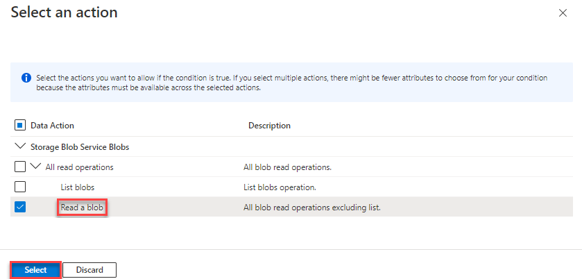 Появляется область "Выберите действие". Эта панель — отфильтрованный список действий с данными на основе назначения роли, на который будет нацелено ваше условие. Установите флажок рядом с Читать блок, а затем выберите Выбрать: