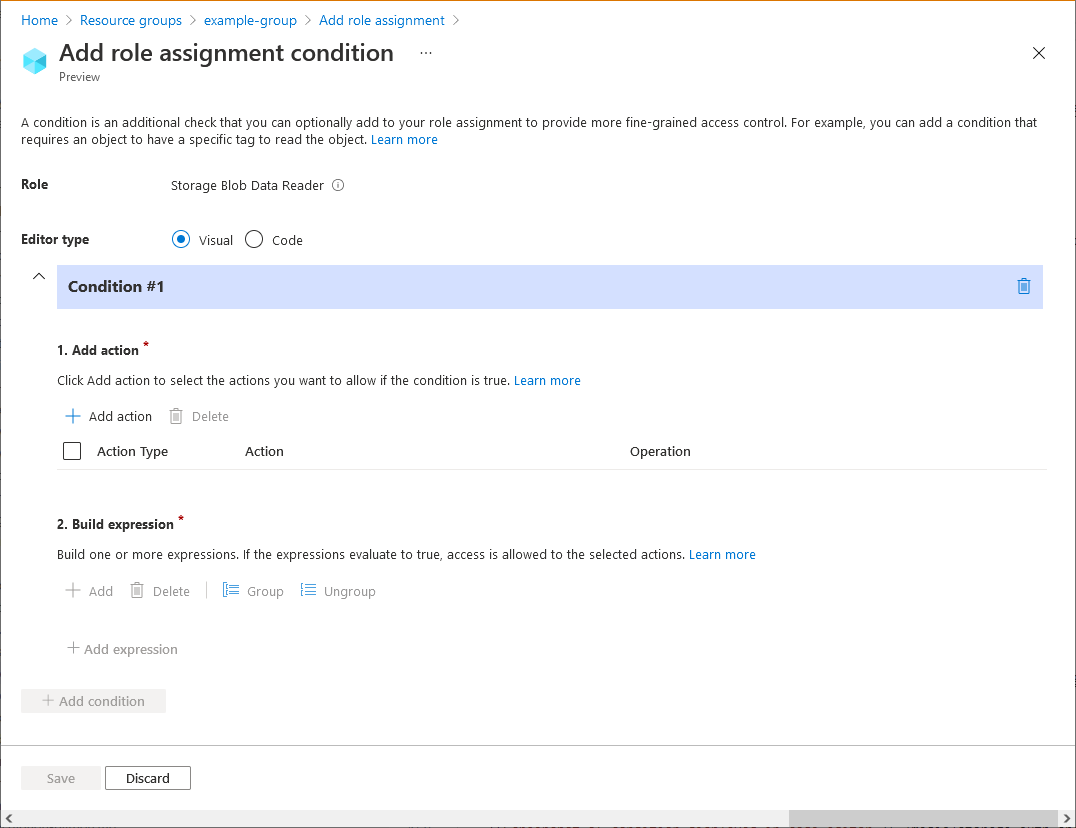 - На вкладке "Условия" (необязательно) выберите "Добавить условие". Откроется страница "Добавить условие назначения ролей":