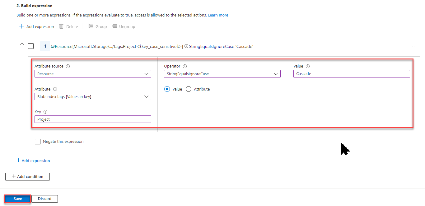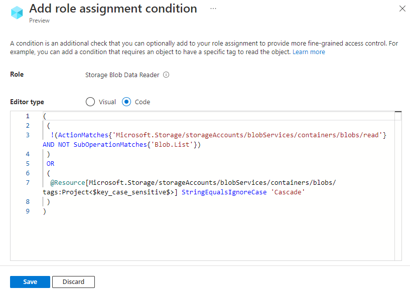В этом руководстве описано, как ограничить доступ к blob-объектам с определенным тегом. Например, вы добавляете условие в назначение роли, чтобы Chandra могли считывать только файлы с тегом Project=Cascade.
