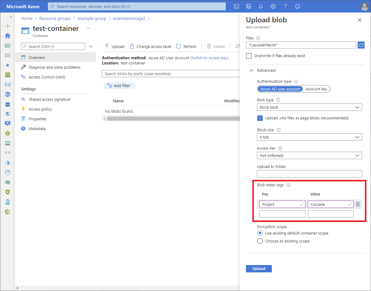 Если вы не видите раздел тегов индекса BLOB-объектов и только что зарегистрировали подписку, возможно, вам понадобится подождать несколько минут, чтобы изменения вступили в силу. Дополнительные сведения см. в статье "Использование тегов индекса BLOB-объектов для управления и поиска данных в хранилище BLOB-объектов Azure".