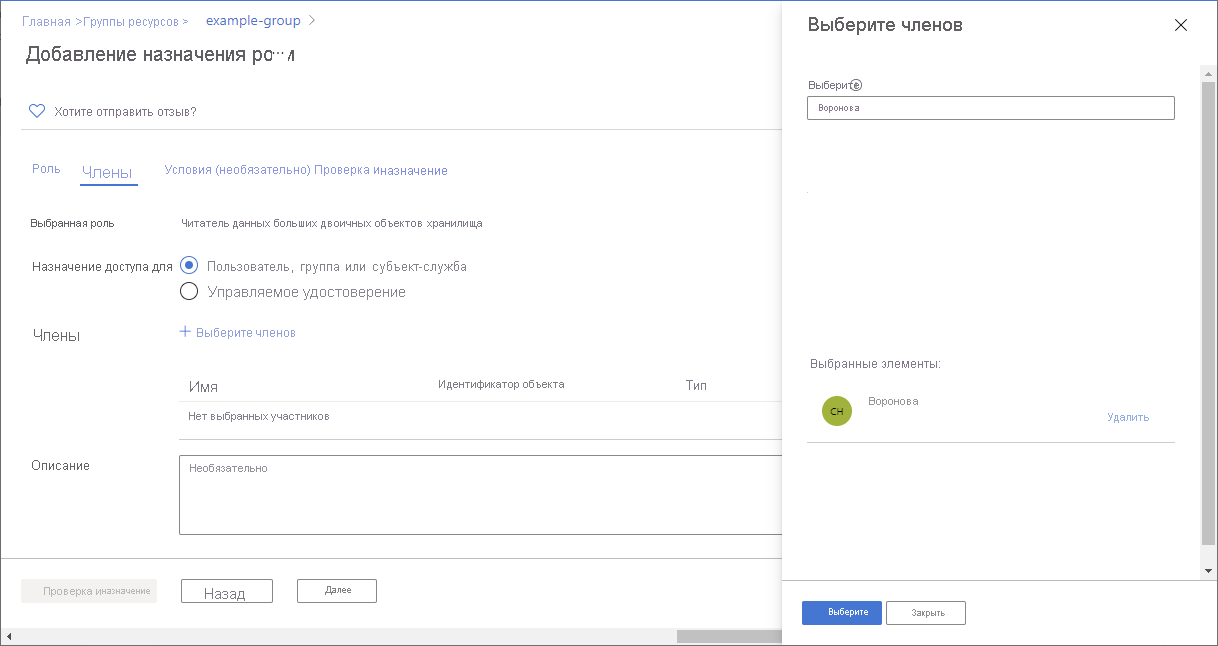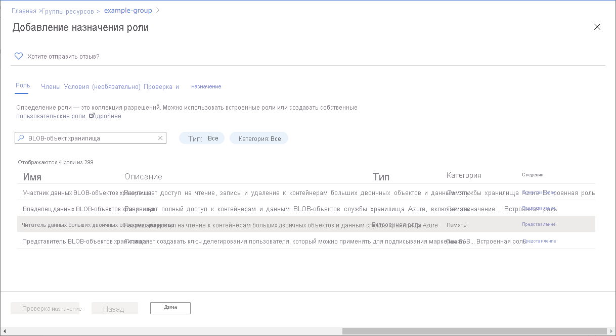 - На вкладке "Роли" выберите роль Storage Blob Data Reader.