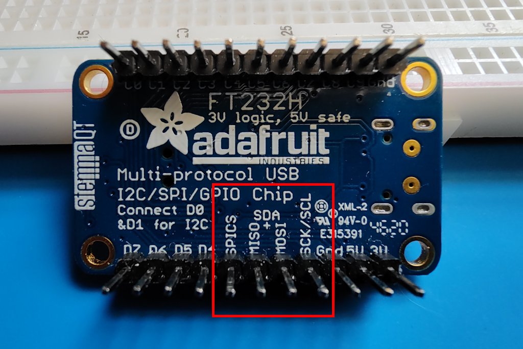 Для обмена данными SPI для линий SCK, MOSI, MISO и CS используются контакты D1, D2 и D3 на адаптере FT232H. Переключатель селектора I2C на адаптере FT232H должен иметь значение Off.