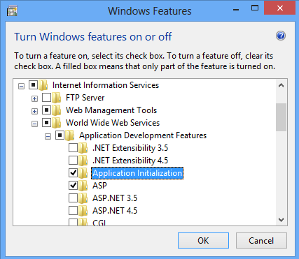 - Разверните узлы Службы IIS, Веб-службы, Функции разработки приложений, а затем выберите Пункт Инициализация приложений.