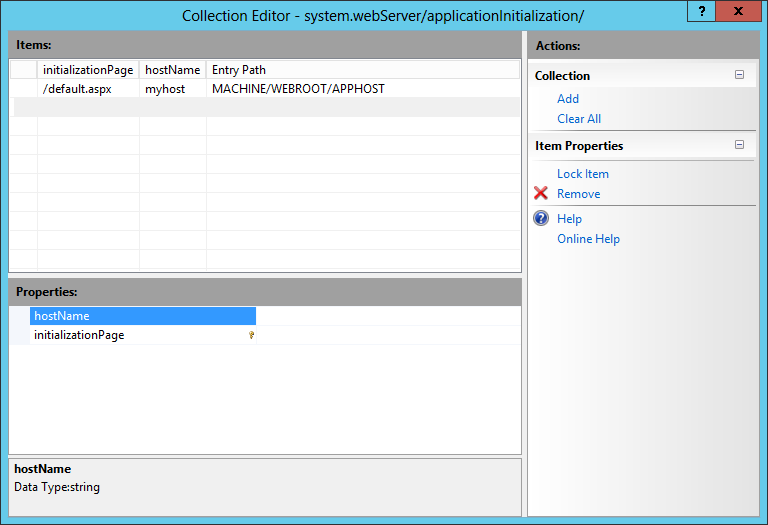 Чтобы добавить приложение для инициализации, в редакторе коллекций нажмите кнопку Добавить, выберите hostName, а затем задайте hostName в качестве имени узла. Щелкните initializationPage и задайте URL-адрес приложения. Закройте диалоговое окно.