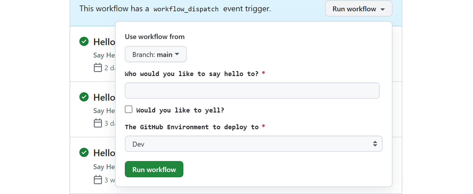 Система CI может позволить вам активировать эти рабочие процессы или конвейеры из собственных пользовательских интерфейсов через API. Для GitHub Actions ключевым моментом выполнения этой задачи является REST API Actions для инициирования события запуска рабочего процесса для запуска выполнения процесса. Триггеры Azure DevOps аналогичны, и вы также можете использовать API Конвейера Azure DevOps для выполнения. Скорее всего, вы увидите те же возможности в других продуктах. Независимо от того, активируется ли вручную или через API, каждый рабочий процесс может поддерживать набор входных данных, добавив конфигурацию workflow_dispatch в файл YAML рабочего процесса. Например, это то, как наборы средств портала, такие как Backstage.io взаимодействуют с GitHub Actions.