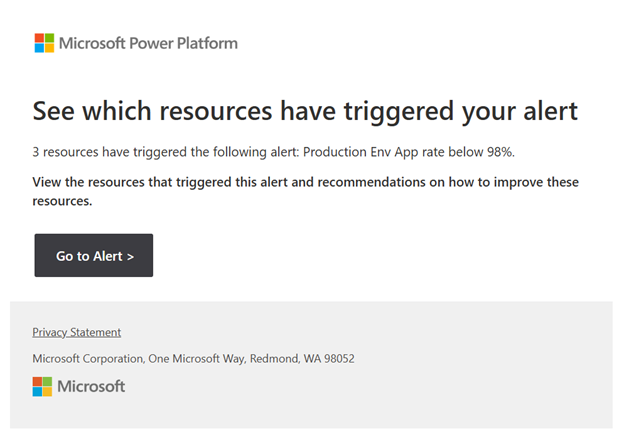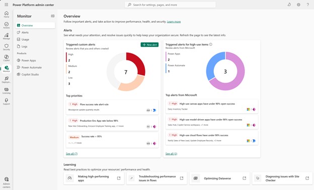 Power Platform IT, операциялар және үздік орталық топтарына денсаулығы нашарлаған қосымшаларды, ағындарды және агенттерді табуға көмектесетін алдын ала анықталған ескертулерді қамтиды. Алдын ала анықталған ескертулер ұйымының жағдайын бақылау үшін арнайы ескертулерді қолданбаған клиенттерге ең көп құндылық береді.