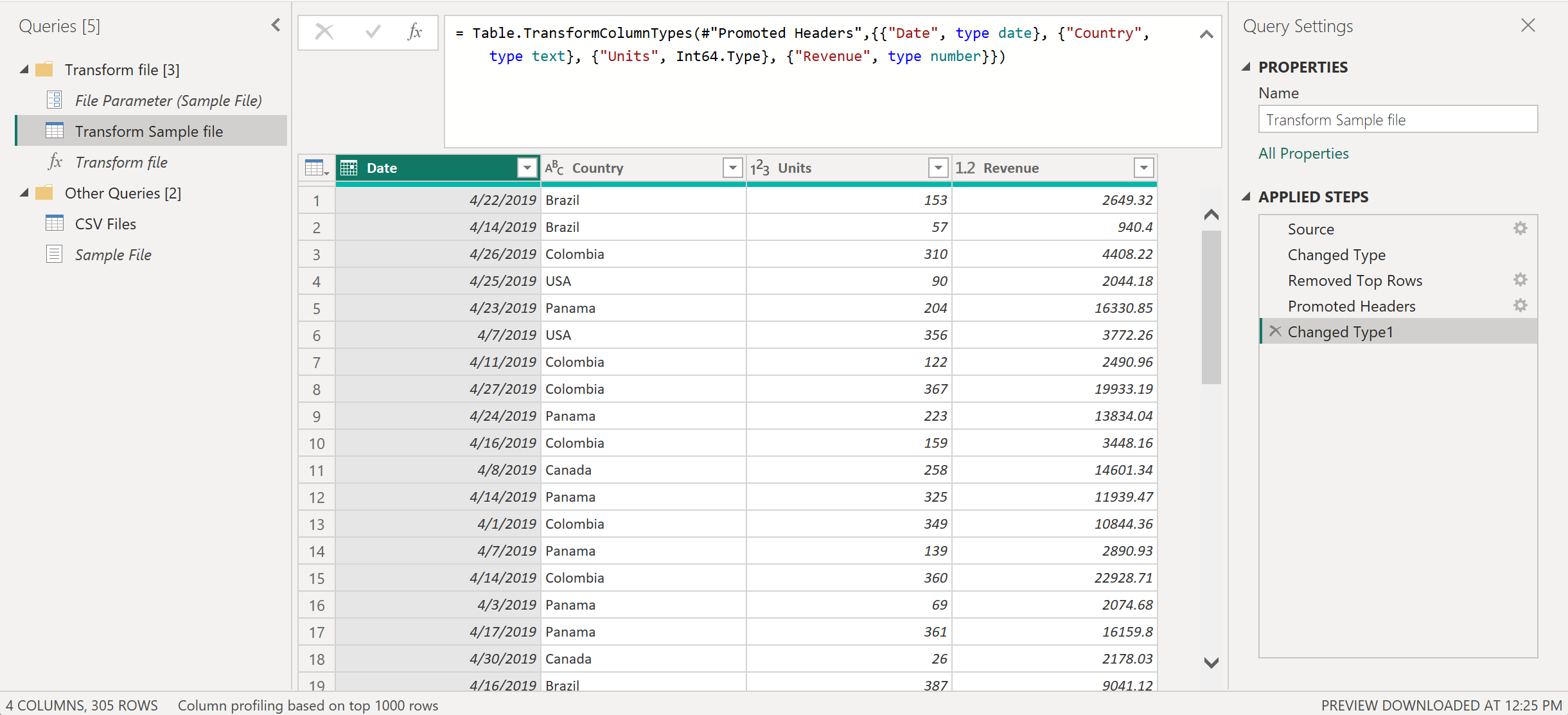 После продвижения заголовков столбцов Power Query по умолчанию автоматически добавляет новый измененный тип шаг, который автоматически обнаруживает типы данных для каждого столбца. Запрос для образца файла преобразования выглядит так, как на следующем изображении.