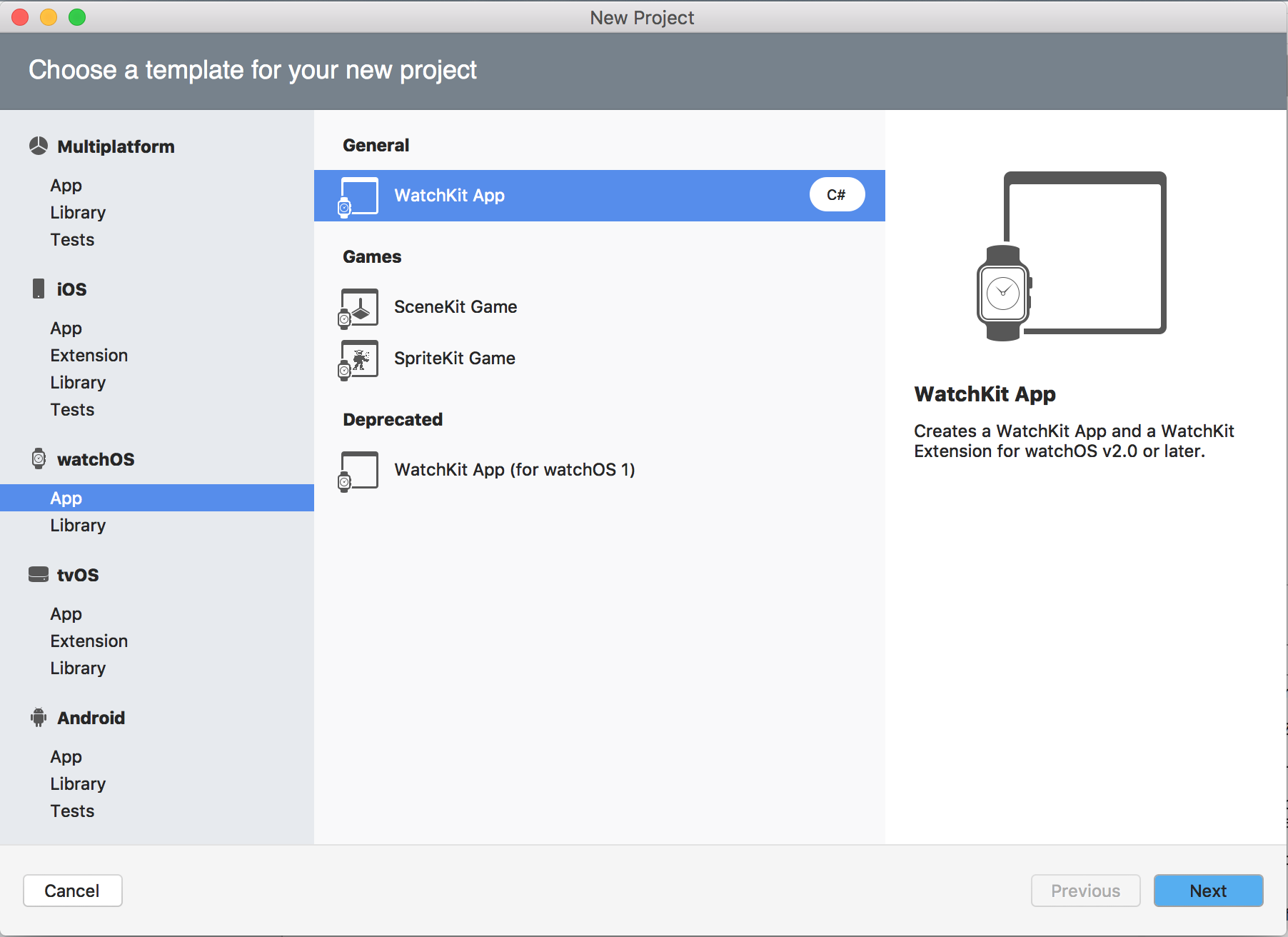 После создания приложения iOS (или вы планируете использовать существующее приложение iOS), щелкните решение правой кнопкой мыши и нажмите кнопку "Добавить > новый проект"... В окне "Новый проект " выберите приложение watchOS > App > WatchKit: