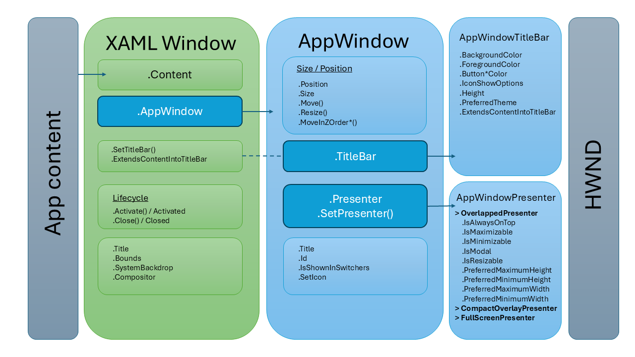 Функции окна в приложении WinUI предоставляются сочетанием класса XAML Window и AppWindow класса, оба из которых основаны на модели Win32 HWND.