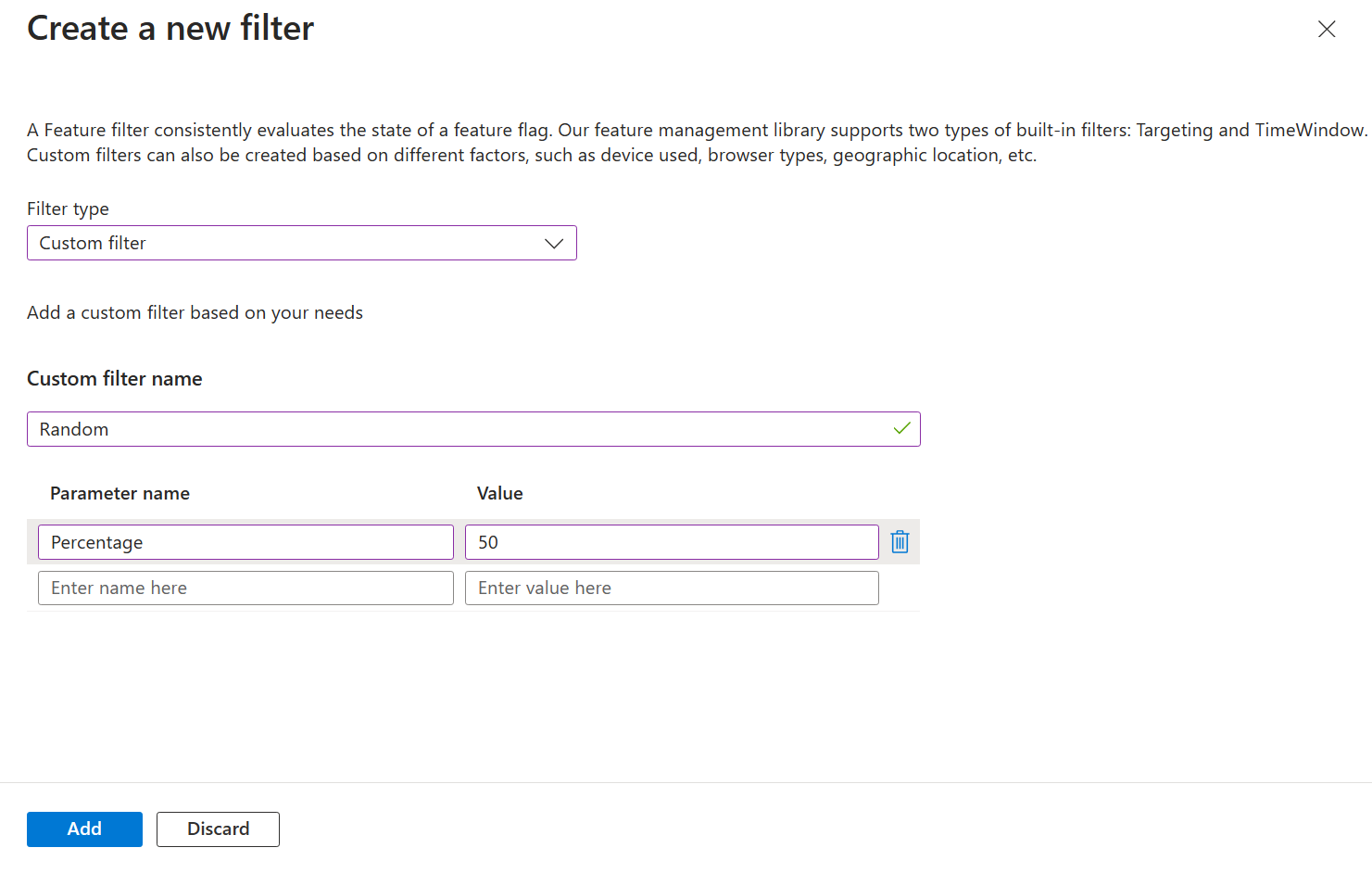 기능 필터는 구성 가능한 조건에 매개 변수를 선택적으로 사용할 수 있습니다. 이 예제에서는 50%의 확률로 기능 플래그를 켜도록 필터를 구성합니다. 코드에서 필터를 구현하는 경우 지정된 백분율과 난수를 사용하여 기능 플래그의 상태를 평가합니다.