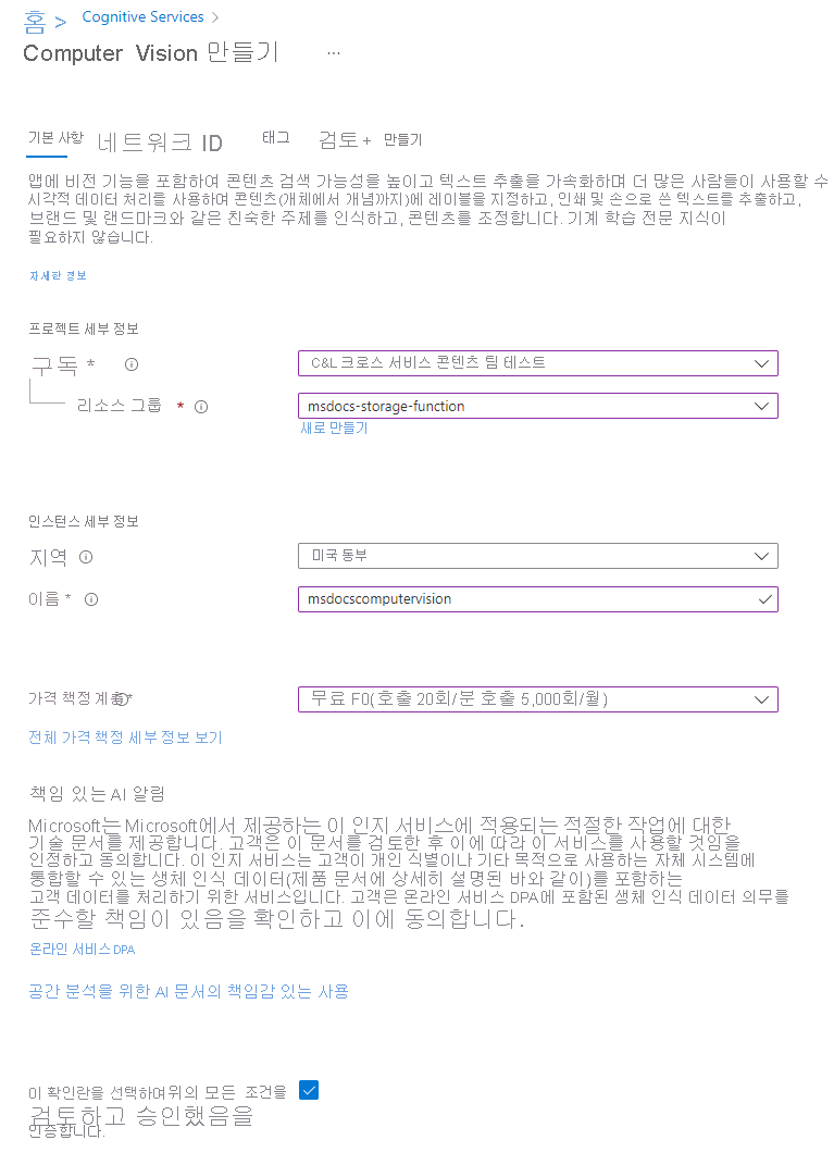 msdocscomputervision을 입력합니다. - 가격 책정 계층: 무료를 사용할 수 있으면 무료를 선택하고, 그렇지 않으면 표준 S1을 선택합니다.