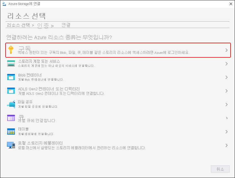 Storage Explorer를 처음 시작할 때 Microsoft Azure Storage Explorer - Azure Storage에 연결 창이 나타납니다. Storage Explorer에서는 몇 가지 방법으로 스토리지 계정에 연결할 수 있지만, 현재는 ACL을 관리하는 한 가지 방법만 지원됩니다.