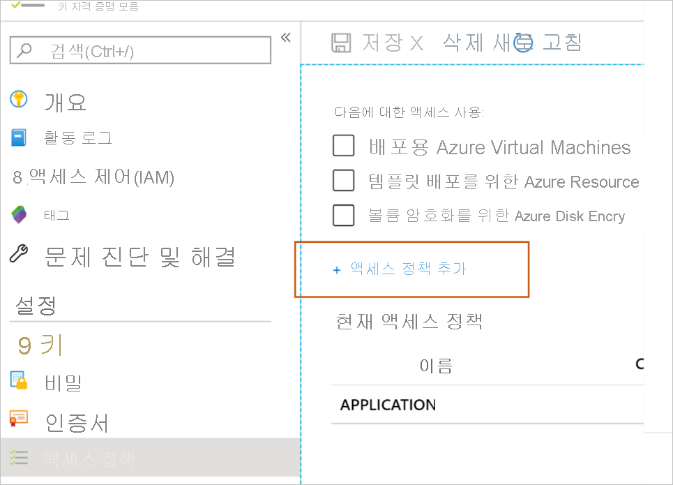 ‘키 자격 증명 모음’>액세스 정책으로 이동합니다. 액세스 정책 추가를 선택합니다.
