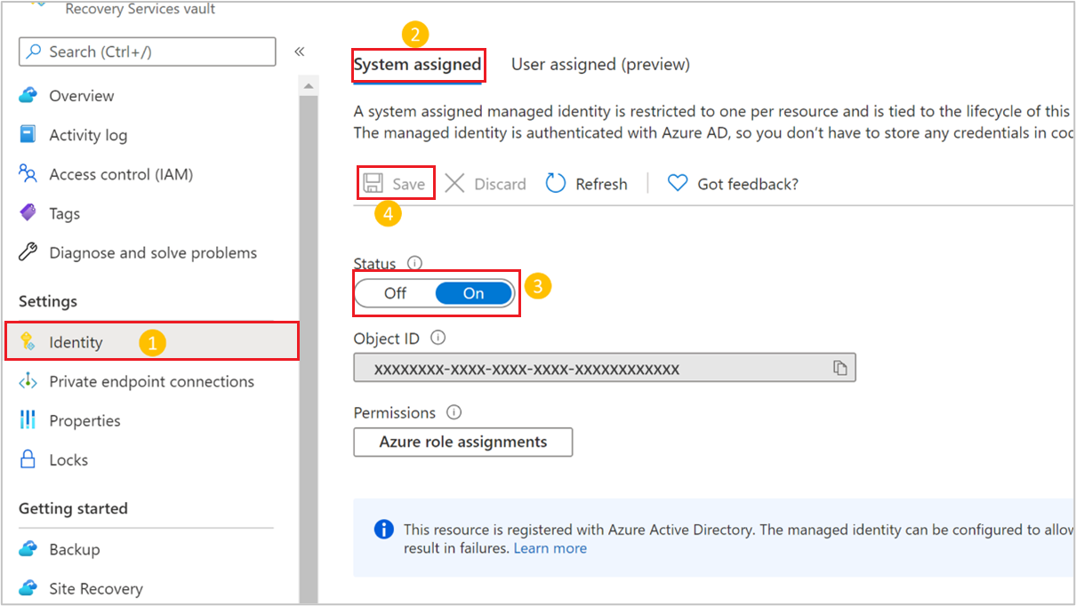 - Recovery Services 자격 증명 모음의 시스템 할당 관리 ID를 사용하도록 설정했거나 사용자가 할당한 관리 ID를 자격 증명 모음에 할당합니다.