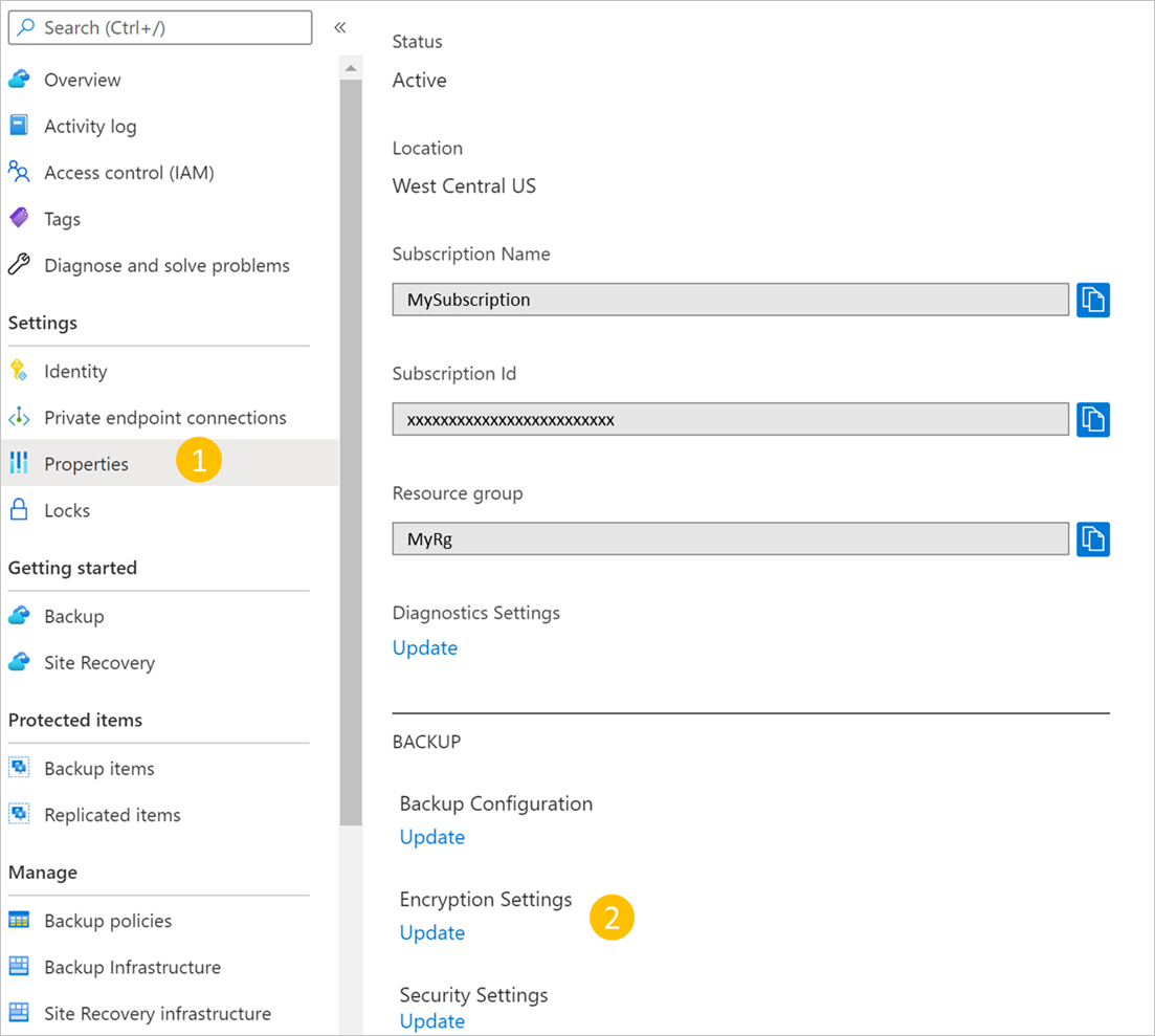 ‘Recovery Services 자격 증명 모음’>속성으로 이동합니다.