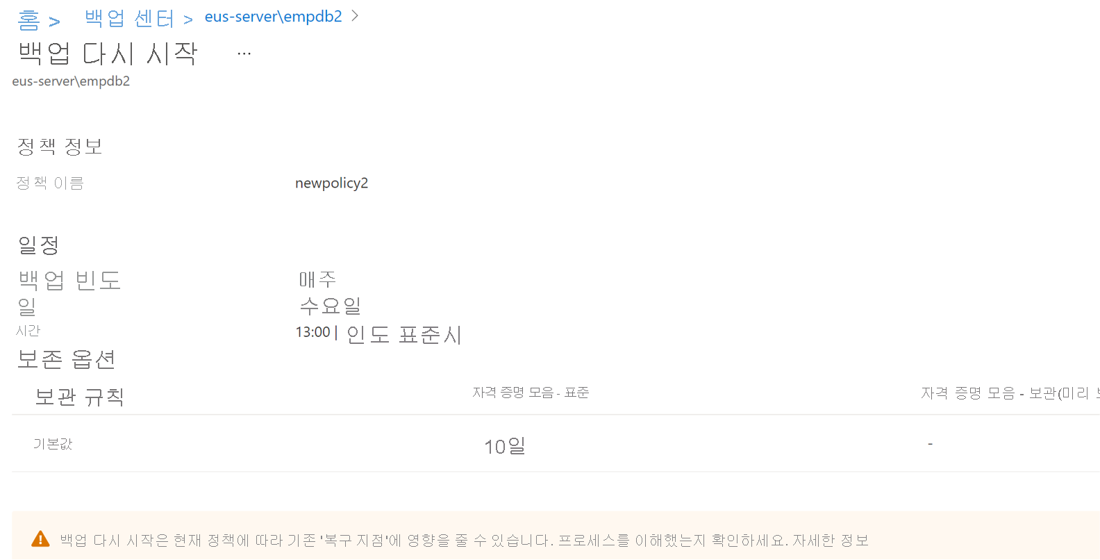 백업 정책을 변경해도 기존 복구 지점 및 해당 보존 기간에는 영향을 주지 않습니다. 업데이트된 보존 설정은 정책 변경 후 만든 새 복구 지점에만 적용됩니다.
